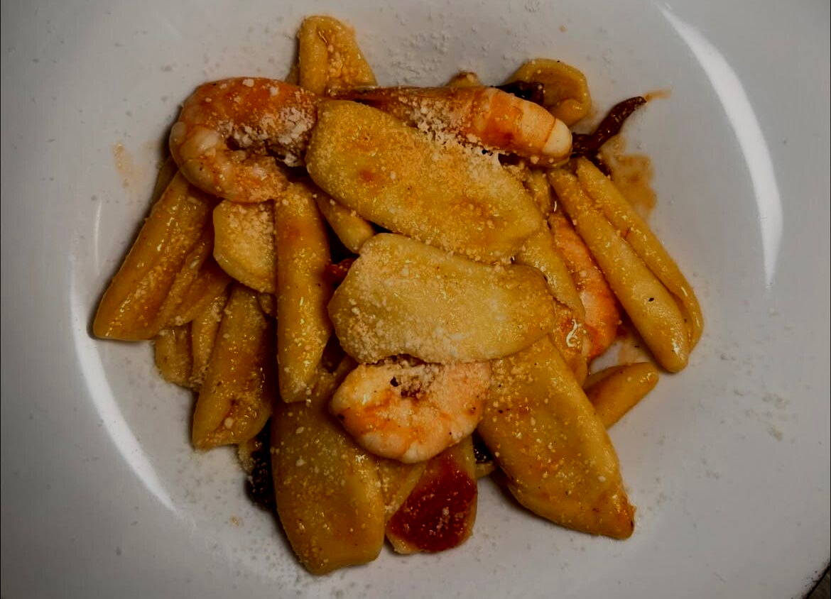 Con gamberi, guanciale e pecorino.